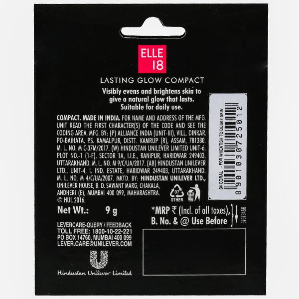 Product Information – Enhance your skin tone with this glow compact from Elle 18. With a single application, this compact hides all skin imperfections and gives you a radiant glow. You'll see an evenly spread, fairer look and the natural glow and smooth matte finish of this compact can complement your everyday look. Its advanced powder formula works well to conceal dark circles, spots, and blemishes. Accentuate your face with this compact for a bright and clear look. Buy the Glow Compact in Pearl shade that comes in this 8gm pack that will fit easily in your bag to take wherever you go.