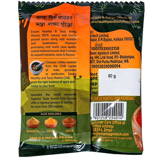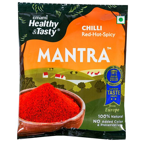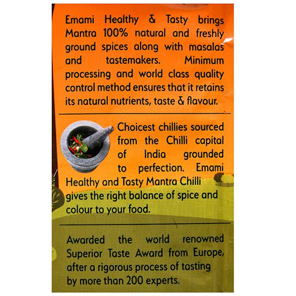 Emami Healthy & Tasty Mantra Chilli Powder Red Hot Spicy is one of the finest quality distinguished by their brilliant red colour and mild pungency. Chilli is a heating spice and comes in a wide variety of shapes, sizes, colours, and degrees of pungency. It is used in Indian dishes for their reddish colour. Chillies are a great source of vitamin C and good for digestion.