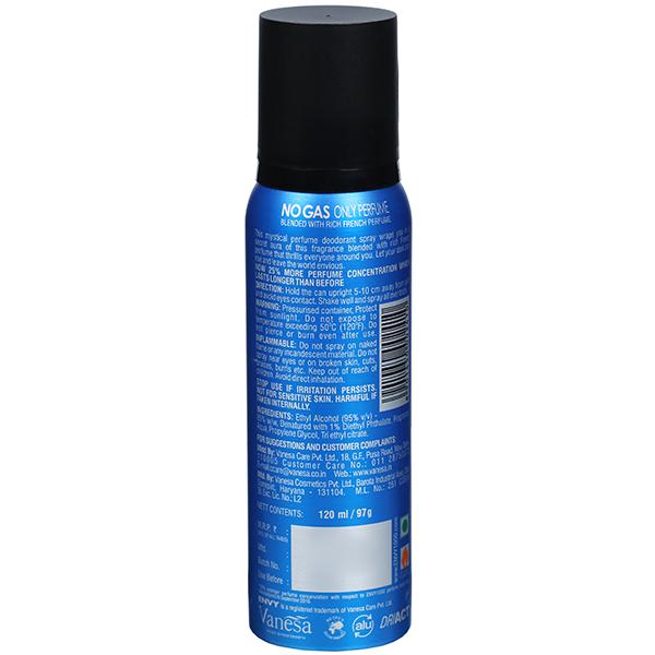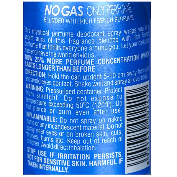 Product information- This mystical perfume deodorants spray wraps you in a secret of this fragrance blended with rich French perfume that thrills everyone around you. Let your dark side rise and leave the world envious.