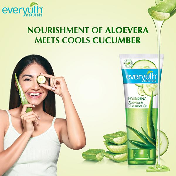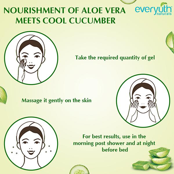 Product Information- The new Everyuth naturals aloe vera cucumber gel has 100% natural aloe vera enriched with cucumber extracts. Aloe vera is nature's solution for multiple skin problems. It hydrates, nourishes and helps treat minor skin issues such as acne, rashes and cuts. Cucumber helps in soothing the skin and reducing the appearance of pores. Get healthy, soft and glowing skin!. Everyuth Naturals Nourishing Aloe vera & Cucumber Gel has 100% natural Aloe Vera enriched with Cucumber extracts. Aloe Vera is nature's solution for multiple skin problems. It hydrates, nourishes, and helps treat minor skin issues such as acne, rashes, and cuts. Cucumber helps in soothing the skin and reducing the appearance of pores. Get healthy, soft, and glowing skin!