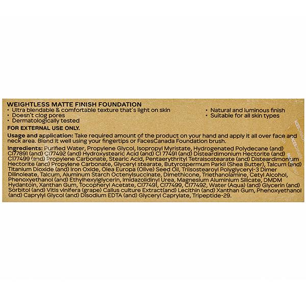 True to its name, the Faces Canada Weightless Matte Finish Foundation is a lightweight foundation, just perfect for daily use. Enriched with the goodness of grape extract, shea butter, and olive seed oil, this multi-benefit foundation blends effortlessly into the skin extending a soft matte finish that lasts throughout the day. Carefully formulated to not clog the pores, the multi-benefit foundation comes with anti-ageing benefits. Dermatologically tested and suited for all skin types, experience a naturally radiant makeup ready base, every day.