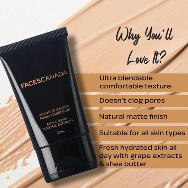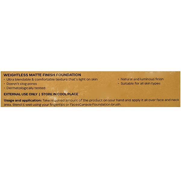True to its name, the Faces Canada Weightless Matte Finish Foundation is a lightweight foundation, just perfect for daily use. Enriched with the goodness of grape extract, shea butter, and olive seed oil, this multi-benefit foundation blends effortlessly into the skin extending a soft matte finish that lasts throughout the day. Carefully formulated to not clog the pores, the multi-benefit foundation comes with anti-ageing benefits. Dermatologically tested and suited for all skin types, experience a naturally radiant makeup ready base, every day.