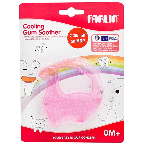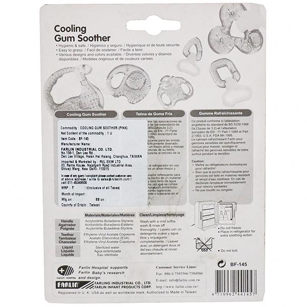 Product Information- Farlin's dinosaur design water filled- cooling gum soother is a great choice as it is easy to bite and soothe sore gums. It gently massages your baby's gums and helps in the eruption of teeth. The soother is filled with purified water and is BPA free. We have a wide range of soothers which come in different shapes, colors and size.