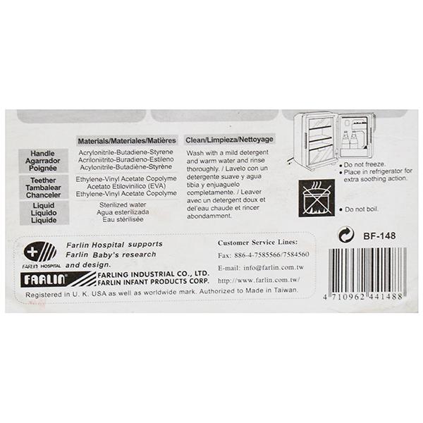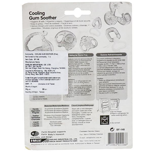 Product Information- Farlin's Elephant design water filled- cooling gum soother is a great choice as it is easy to bite and soothe sore gums. It gently massages your baby's gums and helps in the eruption of teeth. The soother is filled with purified water and is BPA free. We have a wide range of soothers which come in different shapes, colors and size.