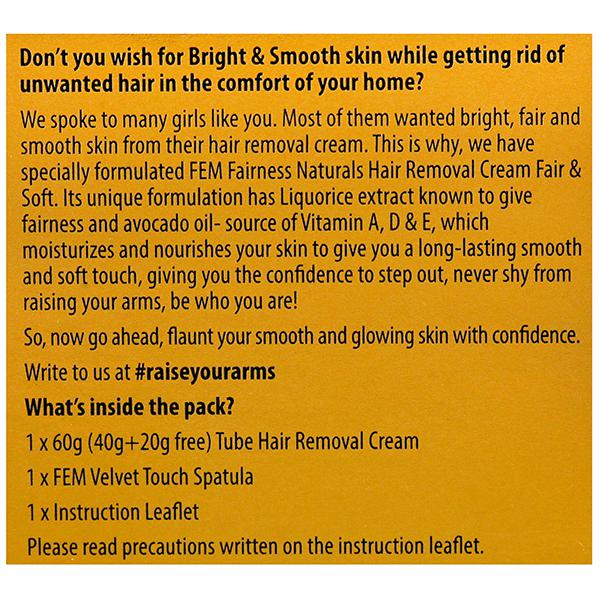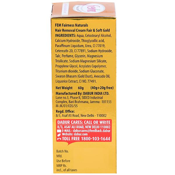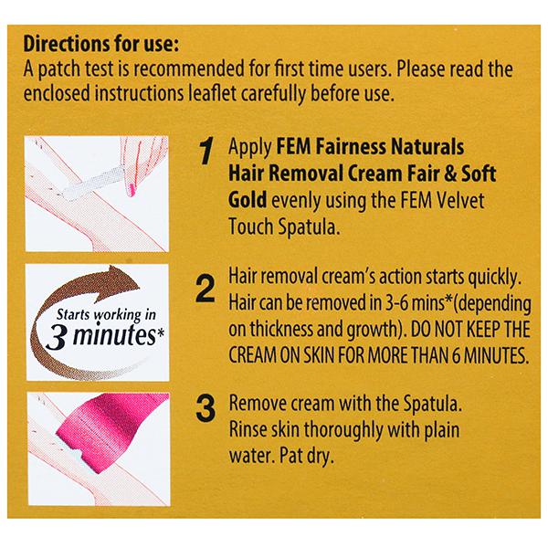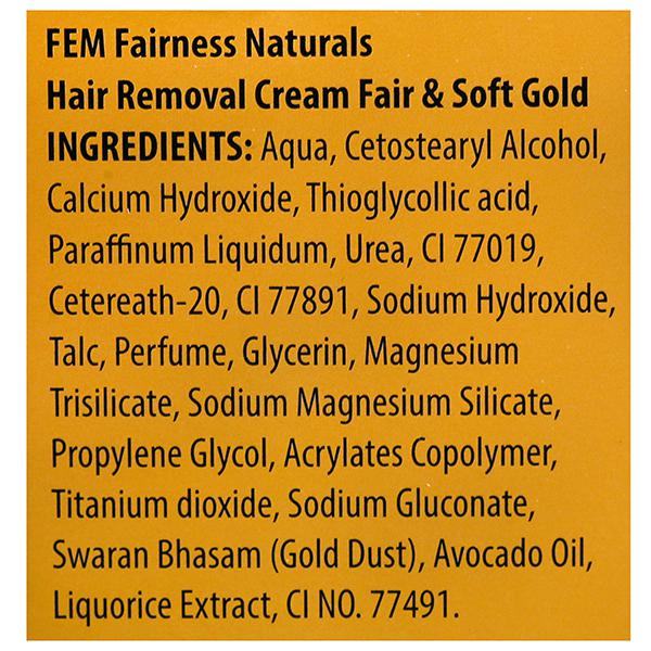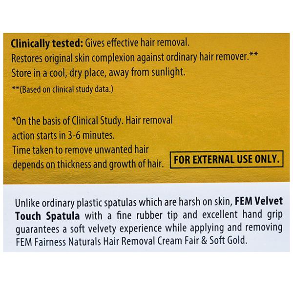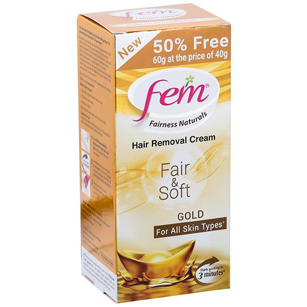 Enriched with the goodness of real Gold particles and jojoba oil, Fem Anti-Darkening Hair Removal Cream (Gold) is an ideal hair removal cream that suits all skin types. The natural gold extracts provide your skin with radiance and jojoba oil makes sure that your skin remains completely moisturised from deep within even post use.