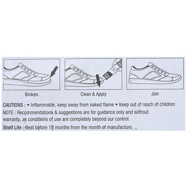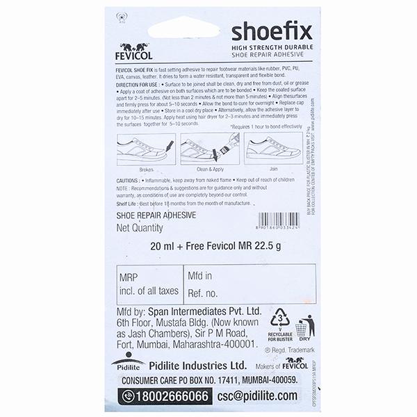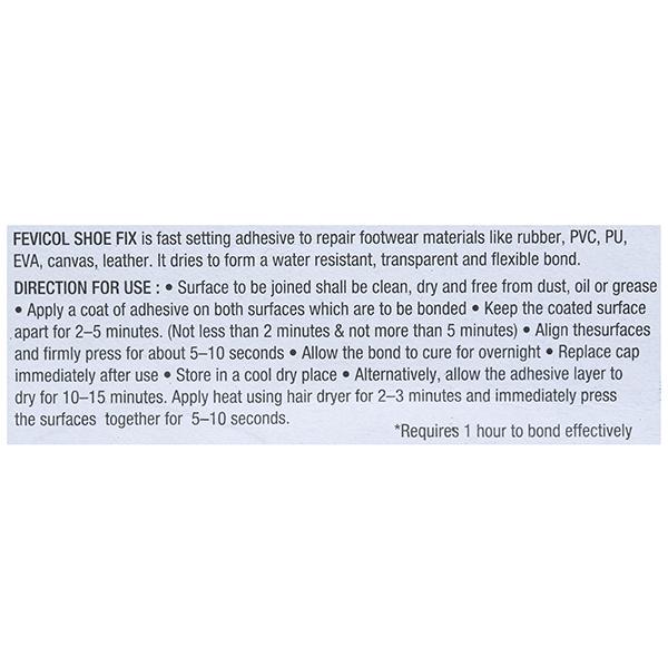 Fevicol shoe fix adhesive is fast setting adhesive to repair footwear materials like rubber, PVC, PU, EVA, canvas & leather. It dries it forms a water-resistant, transparent & flexible bond.
