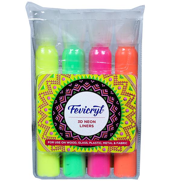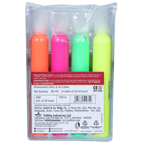 Neon Colours with an edge of fun. A pack of 4 sleek 3D Neon Liners give you the ease with which you can ideally outline, detail your work of art, and have loads of fun doodling thats a rage today. The colours are exciting you have Pink, Green, Yellow and Orange all of which would be distinct once worked with. Write a quote in these vibrant 3D Neon Liners and make your individual style statement. It's great on fabric so there's the scope of fabric art or merely scribble a thought and personalize your garments. It is perfect for dot art on garments or any other surface as they can be applied on multi surfaces. Zentagles, doodling, quote art and it's usage in mixed media projects have now become easier with the launch of this versatile product. Set your own trend and make your style statement with this range.