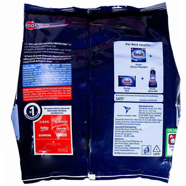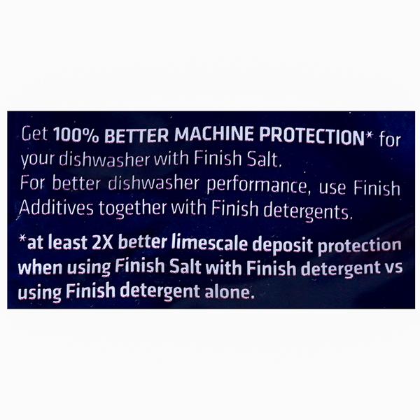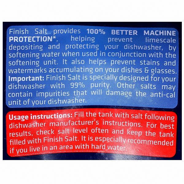 Product Information:- Finish Salt effectively softens your water to boost the cleaning performance of your detergent by preventing spots and watermarks on your dishes. Since Finish Salt is free from residues, its purity ensures that your dishwasher's built-in water softening unit works effectively.