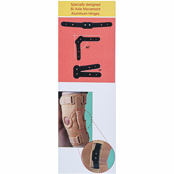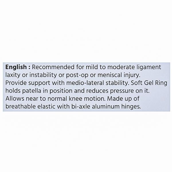 Recommended For mild to moderate ligament laxity or instability related injury or post-op meniscal injury. Provide support with medio-lateral stability. Soft Gel ring holds patella in position and reduces pressure on it. Allows near to normal knee motion. Made up of breathable elastic with bi-axle aluminium hinges. Easy to wear.
