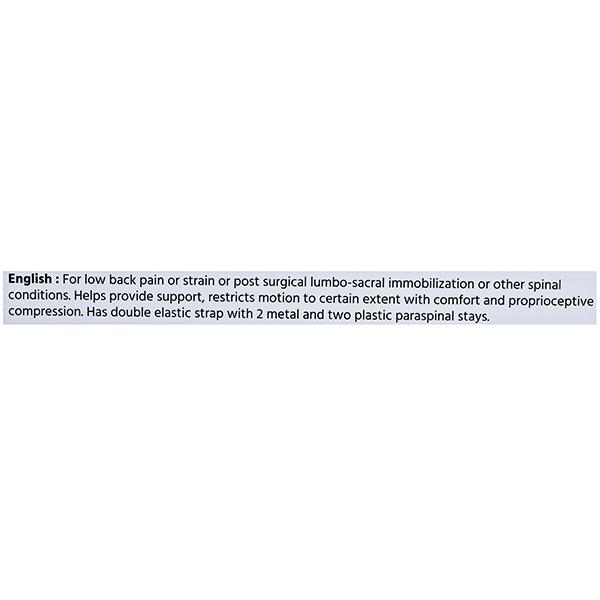 Flamingo Lumbar Corset Belt relieves lower back pain or strain. It is used for post surgical lumbo sacral immobilization or other spinal conditions. It helps provide support and restricts motion to certain extent with comfort and proprioceptive compression. It has double elastic strap with 2 metal and 2 plastic paraspinal stays.