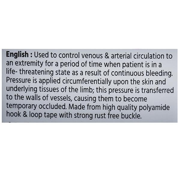 Made from high quality Polyamide hook aod loop tape. Provided with strong, rust free buckle It is compressiong device. It is used ro control venous and arterial circulation to an extremity for a period of time.Pressure is applied circumferentially upon the skin and underlying tissues of a limb; this pressure is transferred to the walls of vessels, causing them ro become temporarily occluded. Used in cannulation or to stem the flow of traumatic bleeding. The tourniquet is usually applied when the patient is in a life-threatening state as a result of continuous bleeding.