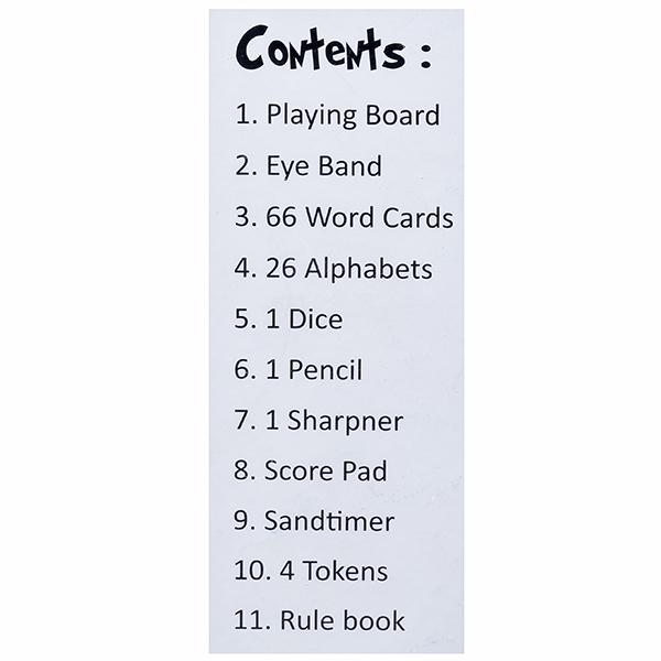 No of contents in a sales package - Playing board, eye band, 66 word cards, 26 alphabets, 1 dice, 1 pencil, 1 sharpner, score pad, sandtimer, 4 tokens, rule book