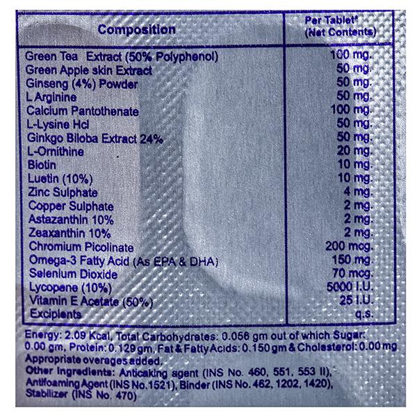 Green Tea Extract (50% Polyphenol): 100 mg, Green Apple Skin Extract: 50 mg, Ginseng (4%) Powder: 50 mg, L Arginine: 50 mg, Calcium Pantothenate: 100 mg, L-Lysine Hcl: 50 mg, Ginkgo Biloba Extract 24%: 50 mg, L-Ornithine: 20 mg, Biotin: 10 mg, Luetin (10%): 10 mg, Zinc Sulphate: 4 mg, Copper Sulphate: 2 mg, Astazanthin 10%: 2 mg, Zeaxanthin 10%: 2 mg, Chromium Picolinate: 200 mcg, Omega-3 Fatty Acid (as EPA & DHA): 150 mg, Selenlum Dioxide: 70 mcg, Lycopene (10%): 5000 I.U., Vitamin E Acetate (50%): 25 I.U., Excipients q.s.