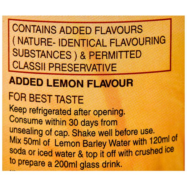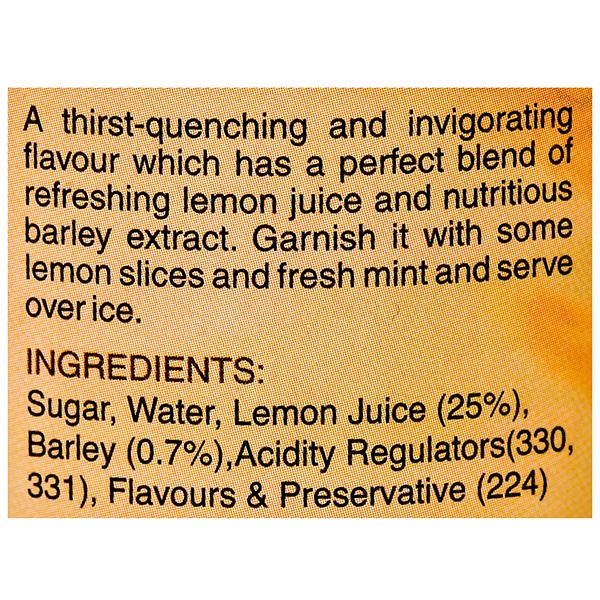 Ingredients: - Sugar, lemon juice, Barley, Water, Thickener, Acidity Regulator, Flavors and PreservativesNutritional Information per 100 g(approx) -