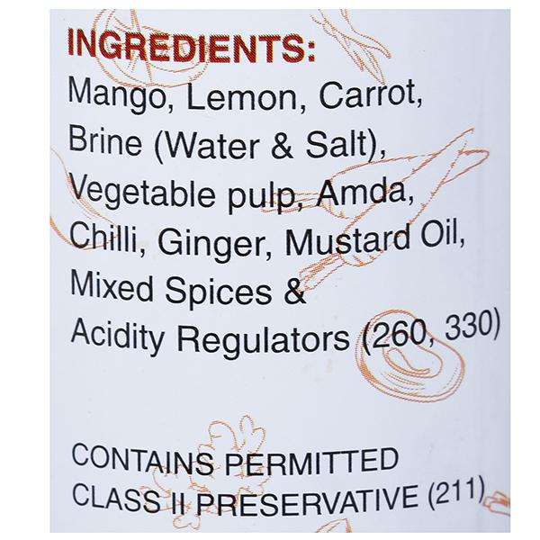 Mango, Lemon, Carrot,Brine(Salt & Water), Vegetable Plup, Amda, Chilli, Ginger, Mustard Oil,Mixed Spices & Acidity Regulators(260, 330)