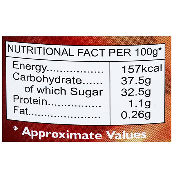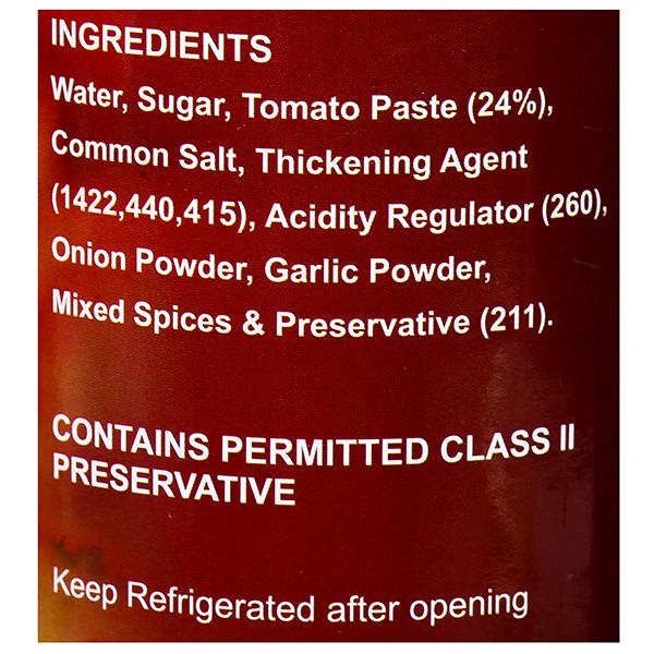 Water, Sugar, Tomato Paste(24%), Red Chilli, Salt, Acidity Regulator(260), Thickening Agents(1422, 440 & 415),Onion Powder, Garlic Powder, Preservative(211) and Mixed Spices.