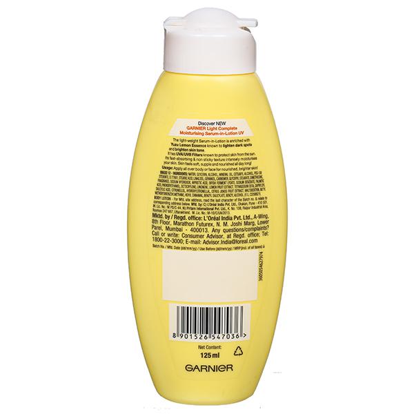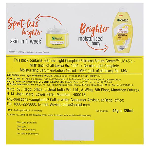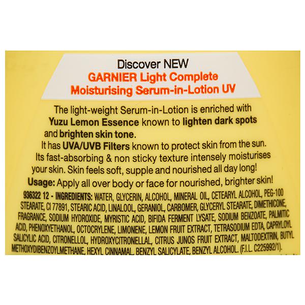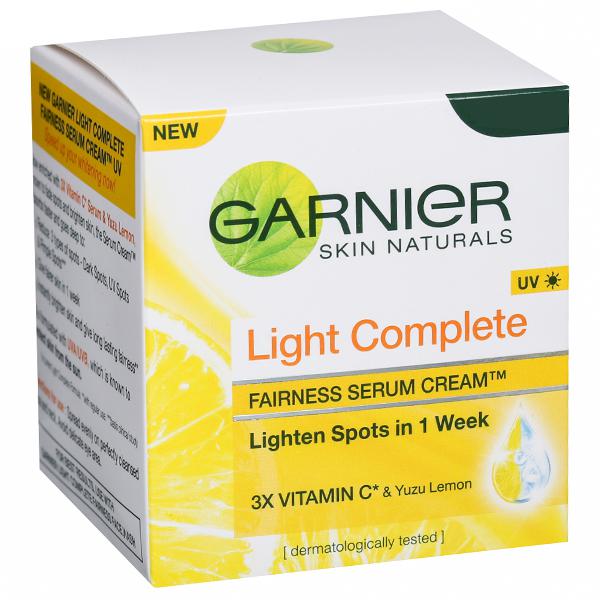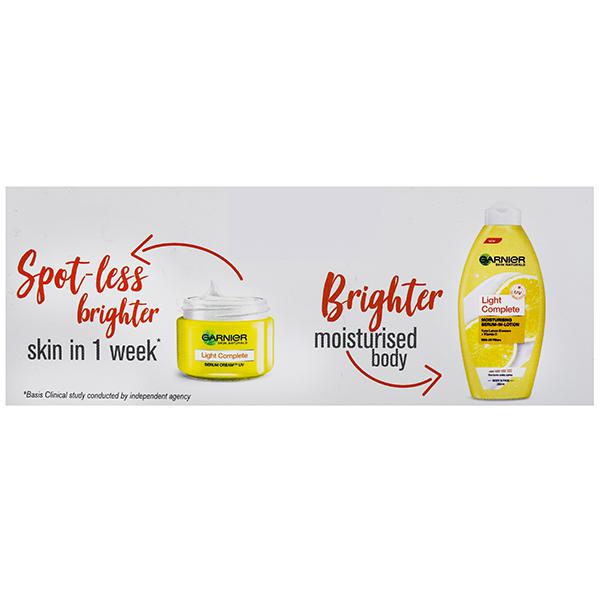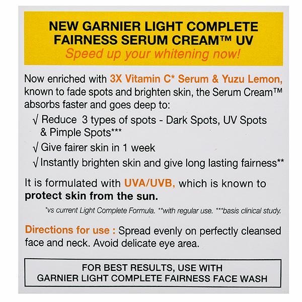 Garnier Light Complete is a face cream for women that is enriched with Japanese Yuzu Lemon. Yuzu Lemon is known as the King of Lemons since it contains a high concentration of Vitamin C and is known for its strong brightening, exfoliating and anti-oxidant properties. The cream also has 3X Vitamin C serum which allows this serum-in-cream formula to absorb fast and go deep into the skin. This face moisturizer gives you spot-less, brighter skin in 1 week. It instantly brightens the skin and gives it a long lasting glow. It also reduces 3 types of spots ? Dark Spots, Pimple Spots and UV Spots. The face cream has UV filters to protect the skin from the harsh sun rays. For fast results, switch to Garnier Light Complete skin care. The cream has been dermatologically tested. How to use - Spread evenly on perfectly cleansed face and neck. Avoid delicate eye area.For best skin care results, use with Garnier Light Complete Face Wash and Garnier Light Complete Yoghurt Night cream.