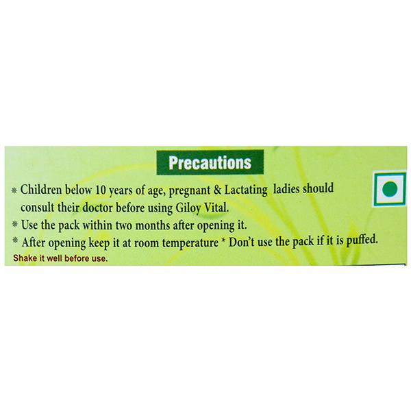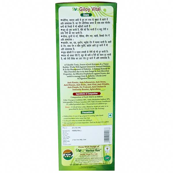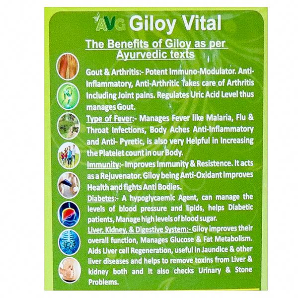 AVG Giloy Vital is processed with the power of giloy satav, amla, ashwagandha & tulsi ‘basil’. It is a strong and high potency formulation which is useful in managing all types of fevers such as dengue, chikungunya, malaria, typhoid and their associated problems. It helps in boosting the immunity and also supports healthy bowel movement.