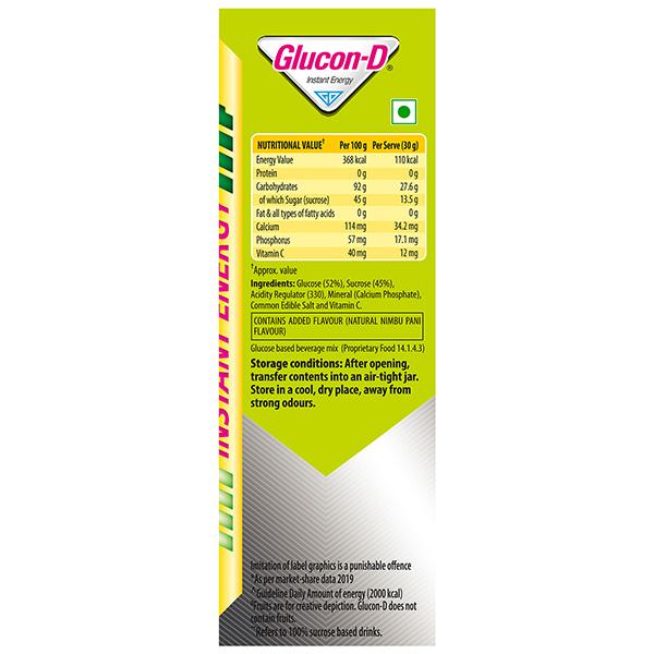 Product Information - Glucon-D contains glucose that helps replenish body glucose and fills you with the energy required to stay active. It is easily absorbed by the body, thus giving out an instant energy boost and refreshment. During summers, mix this powder in a glass of cold water or normal water and consume for best results. Glucon-D energizes you to fight tiredness and fatigue caused by summer heat. Added Nimbu Pani flavour makes it loved by children as well as adults.