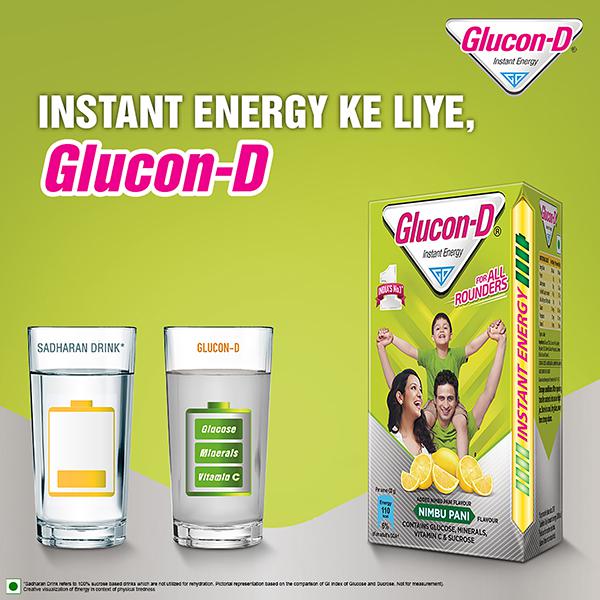 Summers can be daunting and especially when there's an enormous scorching sun always ready to drain out your energy and stop you from being the best of you. But thank god there is Glucon-D! Glucon-D contains glucose that helps replenish body glucose and fills you with the energy required to stay active. It is easily absorbed by the body, thus giving out an instant energy boost and refreshment. Enriched with Vitamin-C and Minerals, including Calcium and Phosphorus, this glucose drink helps charge you up to fight tiredness and promotes mental alertness. What's better? Added Nimbu Pani flavour makes it loved by children as well as adults. Add Glucon-D to a glass of water every day to provide growing active children the energy that keeps them going and adults, refreshment after a long day.