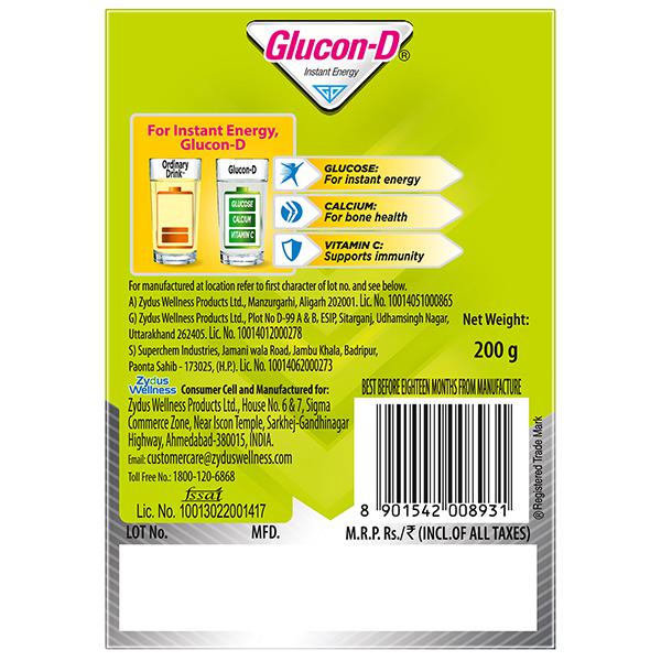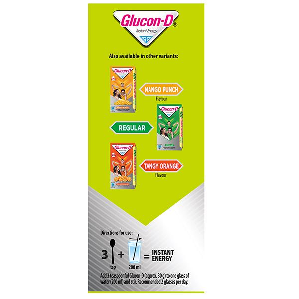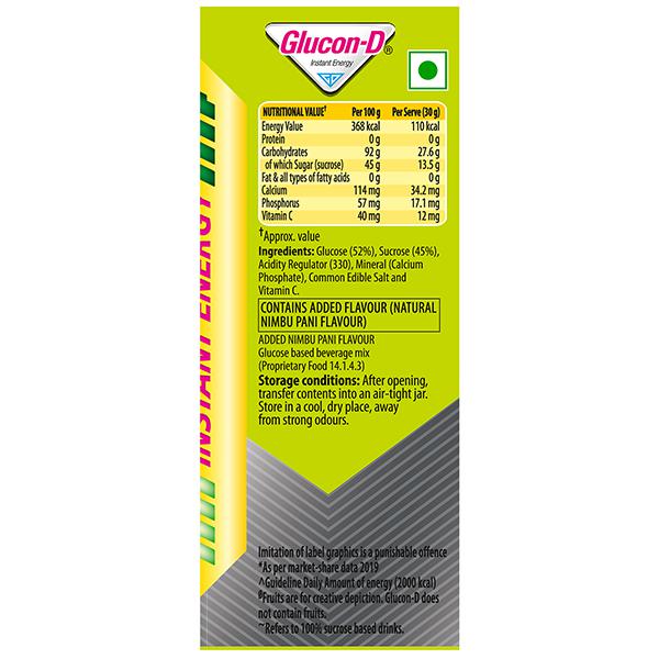 Glucon-D contains glucose that helps replenish body glucose and fills you with the energy required to stay active. It is easily absorbed by the body, thus giving out an instant energy boost and refreshment. During summers, mix this powder in a glass of cold water or normal water and consume for best results. Glucon-D energizes you to fight tiredness and fatigue caused by summer heat. Added Nimbu Pani flavour makes it loved by children as well as adults.