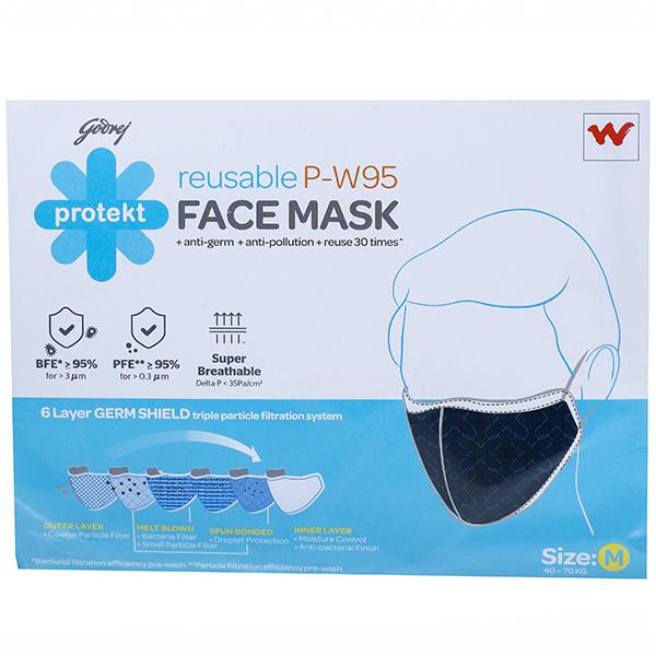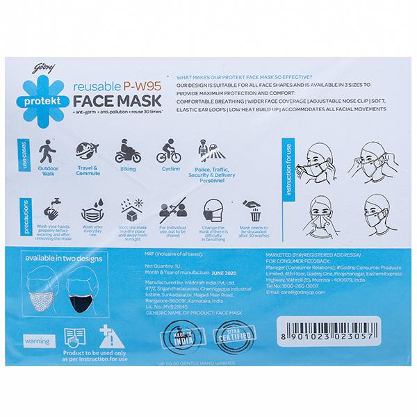 Product Information: Godrej Protekt Reusable P-W95 Face Mask keeps an individual safe by providing protection from bacteria and other small particles. Its anti-germ & anti-pollution properties ensure more comprehensive protection. It has an adjustable nose clip and soft ear loops for maximum comfort.