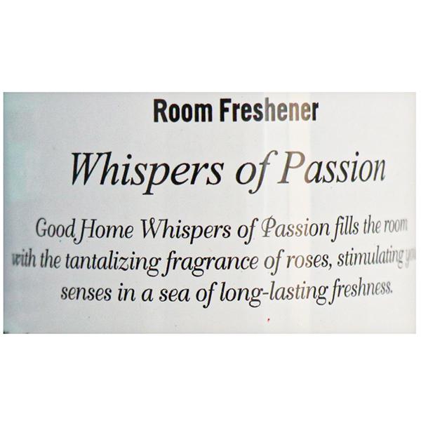 Product Information - Good Home Whispers Of Passion Room Freshener. It's fill the room with the fragrance of Rose which keep musty and stale odours at bay, all day long. Packed with refreshing fragrances, Good Home Room Fresheners will fill every corner of your rooms with pleasant aromas. Now unwind at home surrounded by the best fragrances from Good Home Room Fresheners.