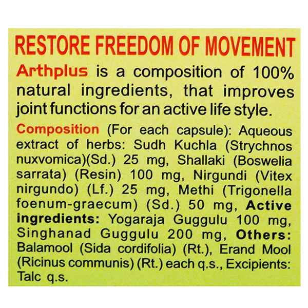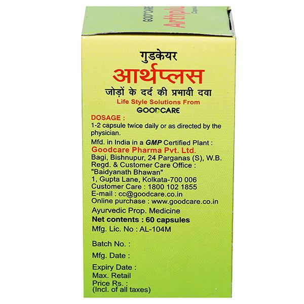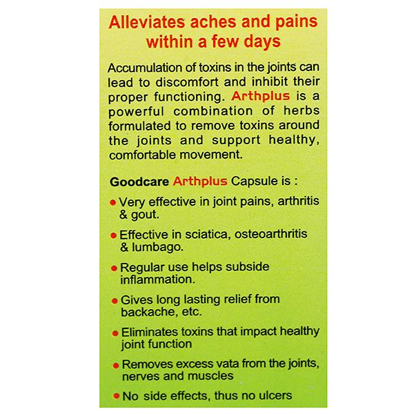 Product Information - With its successful brand names like Neem Guard & Diabet Guard, Goodcare Pharma has recently introduced Arthplus capsule. It is an authentic ayurvedic product that contains pain-relieving Herbal extracts formulated after extensive research undertaken at Goodcare Pharma by leading Ayurvedic physicians, scientist and Botanists. The treatment for Arthritis must aim to reduce joint pains, improves joint functions and helps the patient to lead a healthy life. Arthplus capsule is a powerful combination of Herbs formulated to remove toxins around the joints and support healthy, comfortable movement. It alleviates aches and pains within a few days.