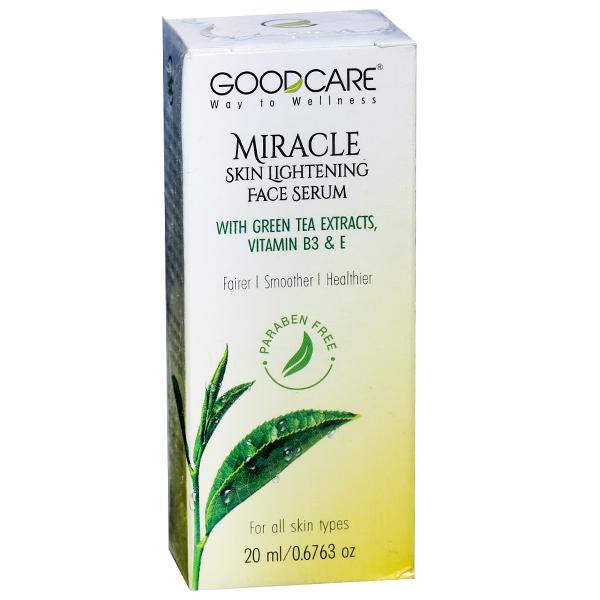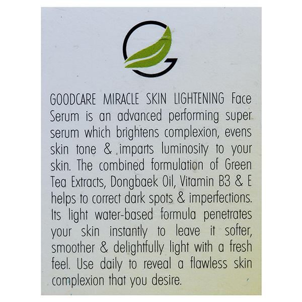 Goodcare Miracle Skin Lightening Face Serum is a rare combination of vitamin B3and E that helps to correct dark spots and imparts luminosity to your skin. The combined formulation of green tea extracts with dongbaek oil will retexture the skin to give you noticeably even toned skin. A compound of brightening ingredients such as whiten SL along with mild fragrance of green tea extracts will soothe your skin and senses. It will leave the skin feeling softer, smoother and delightfully light with a fresh feel.