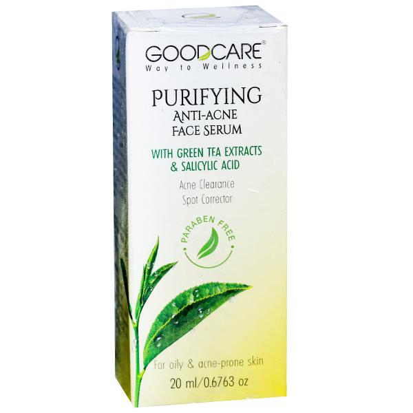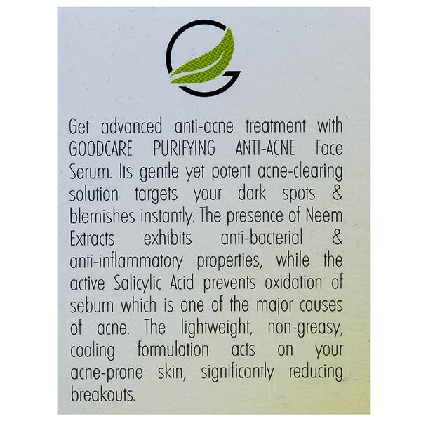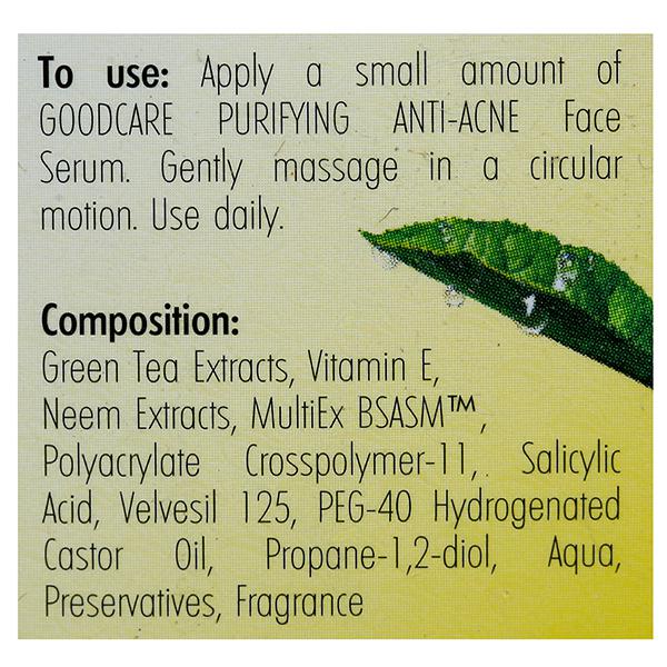 Goodcare Purifying Anti Acne Face Serum uses the anti-inflammatory champ green tea as a major component of this product which repairs the damage done on acne prone skin and neem extracts that is known to be one of the most powerful acne fighters. The famous salicylic acid prevents excess sebum oxidation which prevents your skin from getting a new break out every morning. It has a cooling effect that calms inflamed skin. Regular usage promotes more hydrated and brighter looking skin. It's a natural antioxidant packed in a small bottle for you!!