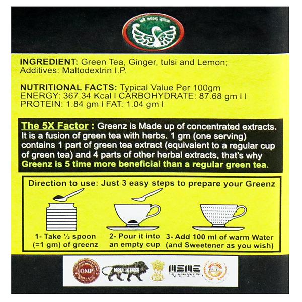 Ingredients - Green Tea, Ginger Tulsi & lemon, Additives: maltodextrin I.P.