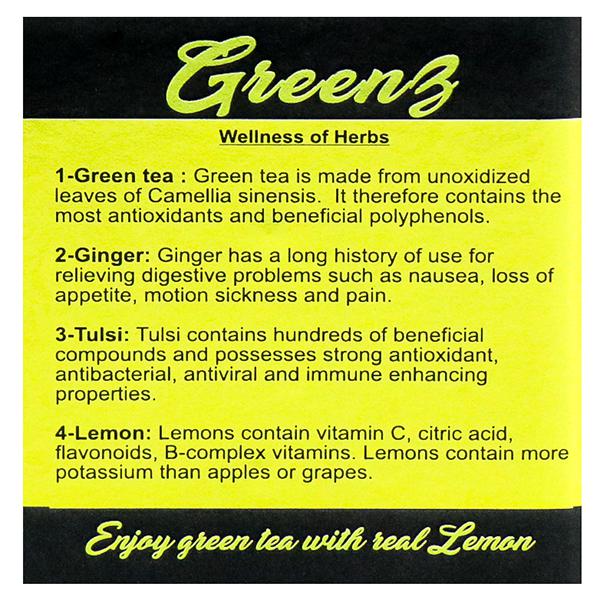 Greenz Green Tea Lemon is an excellent hot drink that contains natural ingredients that boost immunity and maintain normal blood pressure and cholesterol. It helps manage bronchitis, sore throat, and the common cold. Greenz Green Tea Lemon is also beneficial for gastrointestinal problems like ulcers, acidity, and heartburn.