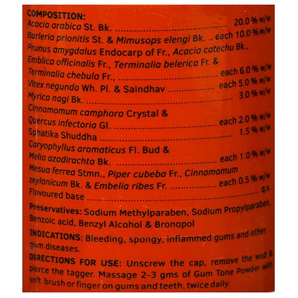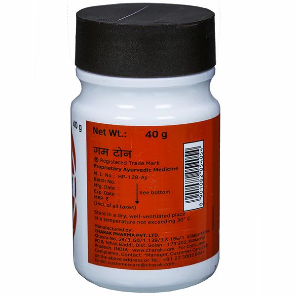 Charak Gum Tone Powder can be used in treating bleeding, spongy and painful gums (Gingivitis). It helps in preventing plaque formation and dental caries. It helps in combating bad breath and is completely free from tobacco.