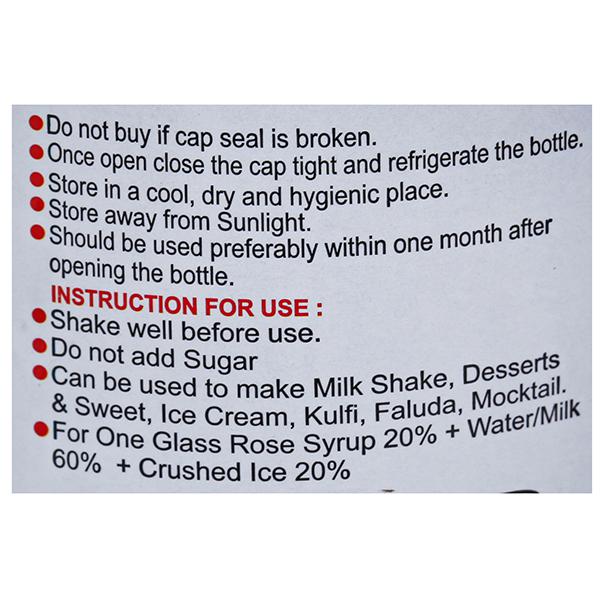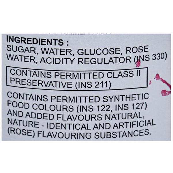 Sugar, Water, Rose Water, Glucose Acidity Regulator Ins 330, Added Class Ii Preservative Ins 211.