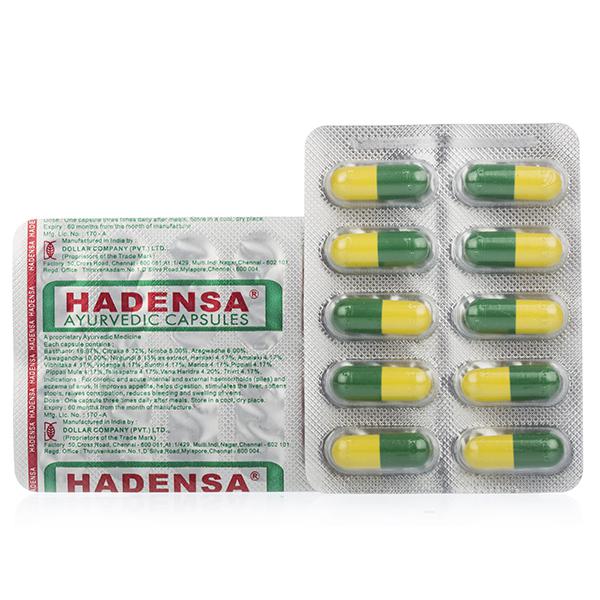 Hadensa capsule can be used in the treatment of Chronic and Acute internal and external hemorrhoids (Piles), eczema of anus and anal fissures. Hadensa capsule contains ingredients to shrink Piles, reduce swelling of veins and bleeding.It stimulates the liver, improves appetite and helps in digestion. Further, the capsule has laxative and wormicidal properties also. All these ensure proper internal treatment of piles and other problems in a most effective manner. The combined usage of ointment- for external application and the ayurvedic capsules - for internal consumption - provides an extremely effective treatment for piles and other problems. It can be safely used by pregnant women, diabetics and people with high blood pressure. Take one capsule 3 times daily after meals. The phile contains 10 capsules.