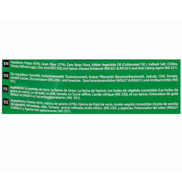 Potato(45%) , Gram Flour (37%) , Dew bean flour , Edible Vegetable Oil(Cotton seed oil ), iodised salt , chillies , Tomato , Refined Sugar , Citric acid (INS 330) and Spices .Flavour enhancer (INS 627 & INS 631 ) and Anti caking Agent (INS 551).