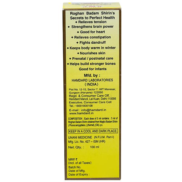 Hamdard brings all the goodness of almond in the form of Roghan Badam Shirin. It is 100% pure almond oil made from the finest quality sweet almonds, using processes that are GMP and ISO9001:2008/HACCP certified. Unlike similar products available in the market, Hamdard uses only almonds of one particular type called the Maghz Badam, which imparts consistency to taste, colour and efficacy of Roghan Badam Shirin. Roghan Badam Shirin has a number of benefits; it keeps the heart healthy, alleviates constipation in a natural way, strengthens brain power, fights dandruff and nourishes skin. It makes the body healthy from within. It also reduces cholesterol and keeps the body warm in winter. Take Hamdard Roghan Badam oil everyday to that perfect health you always wanted. It is good for infants, children, teenagers, adults as well as elderly people. The oil comes in a 100ml bottle.