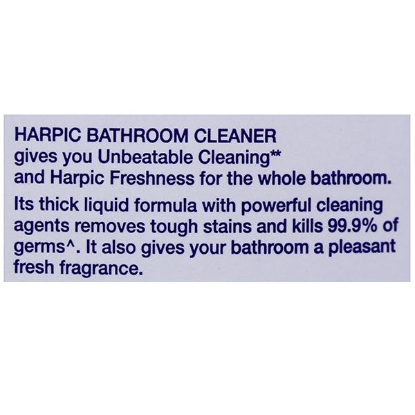 Product Information - Harpic Bathroom Cleaner is a strong bathroom disinfectant and cleaning liquid that helps remove the toughest of stains. It gives you unbeatable cleaning on greasy soil and particulate matter and freshens the whole bathroom. It has a thick liquid formula with powerful cleaning agents that lift and remove tough stains from almost all bathroom surfaces and kills germs to give you a disinfected and germ-safe bathroom.