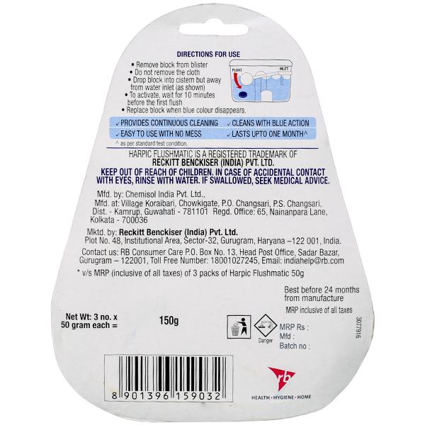Product Information - Harpic Flushmatic Toilet Cistern Block is a toilet hygiene product for continuous cleaning of the mess. It is a drop-in tank tablet which can be used for any accessible cistern. Harpic Flushmatic toilet cleaner works from the inside of the cistern to release a dose of powerful liquid with every flush. Distributing the liquid across the bowl, it helps you maintain a clean toilet flush after flush.
