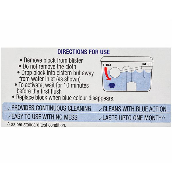 How to use - 1. Remove the block from blister. Do not remove the cloth. 2. Drop block into the cistern, away from water inlet. 3. To activate, wait for 10 minutes before the first flush. 4. Get a clean toilet flush after flush.