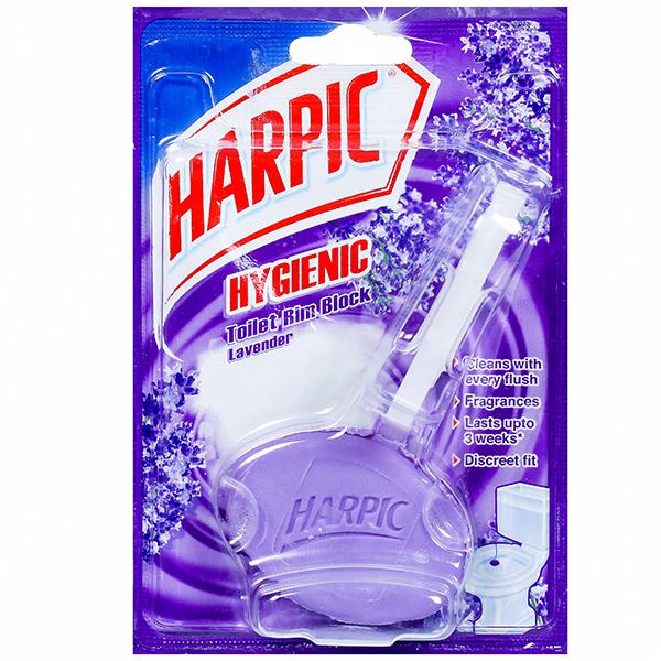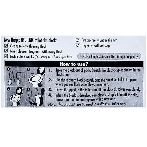 Product Information - Now a product that will clean, shine, perfume and even disinfect your toilet! Harpic Hygienic Toilet Rim Block is an innovative cage-free toilet block that helps clean and freshen with every flush. The toilet rim block works to maintain a constantly fresh and hygienic toilet. So your toilet feels fresher for longer, even in between cleans. Harpic Hygienic toilet rim block targets the toilet bowl for stains and deposits, and keeps it visibly clean and fresh for longer. It fits discreetly under the rim. A single block of Harpic Hygienic toilet cleaner lasts upto 3 weeks depending upon your usage. It can help prevent limescale build-up, keeping your toilet clean for longer.