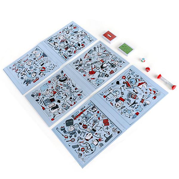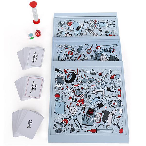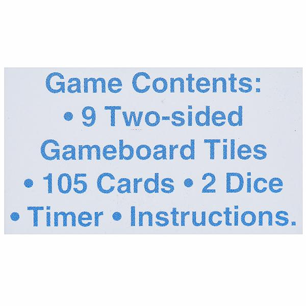 Game contents- 9 two-sided gameboard tiles, 105cards, 2 dice, timer, instructions.