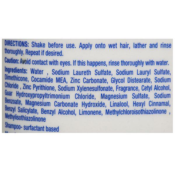 Active Ingredients: Pyrithione Zinc 1% Inactive Ingredients: Water, Sodium Laureth Sulfate, Sodium Lauryl Sulfate, Dimethicone, Cocamide MEA, Zinc Carbonate, Glycol Distearate, Sodium Xylenesulfonate, Fragrance, Cetyl Alcohol, Guar Hydroxypropyltrimonium Chloride, Magnesium Sulfate, Sodium Chloride, Sodium Benzoate, Magnesium Carbonate Hydroxide, Benzyl Alcohol, Methylchloroisothiazolinone, Methylisothiazolinone.