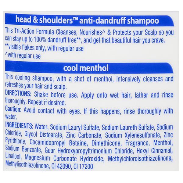Ingredients – Water, SodiumLauryl Sulfate, Sodium Laureth Sulfate,Glycol Distearate, Zinc Carbonate, Sodium Chloride, Sodium Xylenesulfonate, Zinc Pyrithione, Cocamidopropyl Betaine, Dimethicone, Fragrance, Menthol, Sodium Benzoate, Guar Hydroxypropyltrimonium Chloride, Hydrochloric Acid, Magnesium Carbonate Hydroxide, Hexyl Cinnamal, Linalool, Magnesium Nitrate, Sodium Polynaphthalenesulfonate, Methylchloroisothiazolinone, Magnesium Chloride, CI 42090, Methylisothiazolinone, CI 17200
