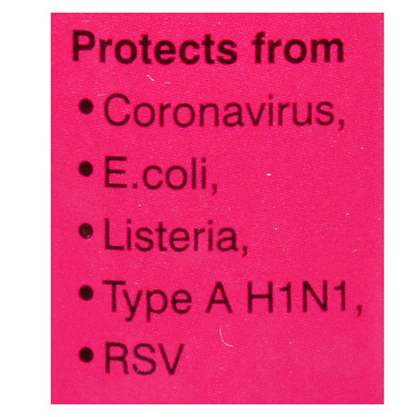 Used For - It helps to protect from Coronavirus, E. coli, Listeria, Type A H1N1 & RSV & also keeps you clean & healthy.