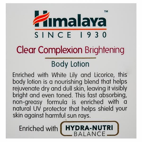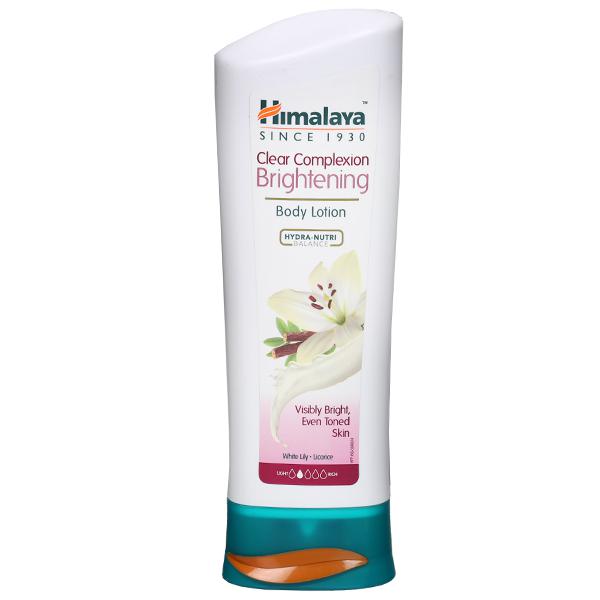 Himalaya Clear Complexion Brightening Body Lotion is enriched with white Lily & Licorice, this body lotion is a nourishing blend that helps rejuvenate dry & dull skin, leaving it visibly bright & even toned. This fast-absorbing, non-greasy formula is enriched with a natural UV protector that helps shield your skin against harmful sun rays.
