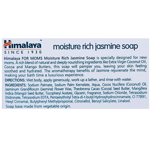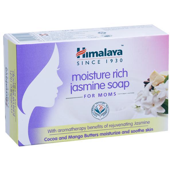 Himalaya Moisture Rich Jasmine Soap For Moms is specially formulated for mothers. Enriched with herbal actives and an uplifting fragrance, this soap helps to maintain skin hygiene during pregnancy. The soap contains natural emollients, such as virgin coconut oil, cocoa butter, and mango butter, which soothe the skin and help prevent post-bath dryness. The pleasant fragrance of jasmine helps calms the mind and relaxes the body