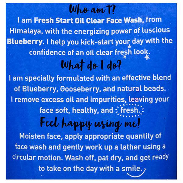 Refresh your skin with the energizing action of Himalaya fresh start oil clear blueberry face wash. Get fresh and oil-free skin with the goodness of luscious blueberry and the deep cleansing action of natural beads. It removes excess oil, dirt and impurities to give you healthy, fresh and glowing skin.