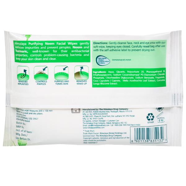 Product Information Himalaya’s Purifying Neem Facial Wipes are soft and non-alcoholic with a gentle formulation that mildly cleanses skin to keep it clean and healthy. Enriched with the power of Neem and Turmeric that are known for antibacterial properties, the wipes freshen skin and also help conveniently remove make-up.