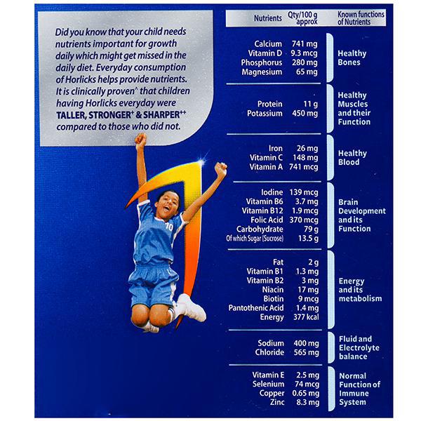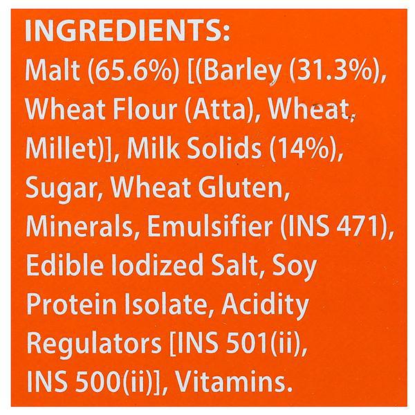 Ingredients - Malted Barley (Extracted Solids) (39%), Wheat Flour (25%), Milk Solids (14%), Sugar, Wheat Gluten, Minerals, Emulsifier (INS 471), Salt, Soy Protein Isolate, Acidity Regulators (INS 501(ii), 500(ii)), Vitamins.